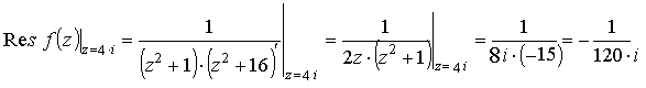 необходимо вычислить вычеты подынтегральной функции в точках z1 = i, z2 = 4·i.