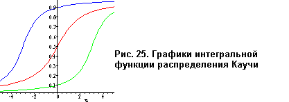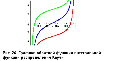 На рис. 25, 26, 27 изображены графики функций (19), (20) и обратной функции CauchyInv(x; α, β) для параметров (α, β) = (- 3,1), (0,1.5), (3,1), и – 5 ≤ x ≤ 5.