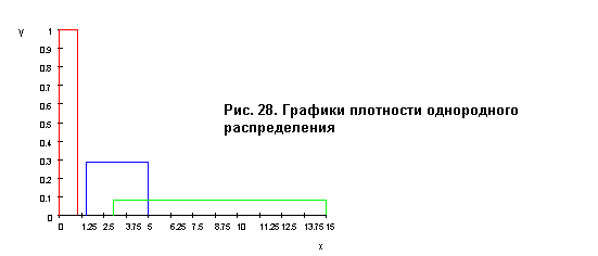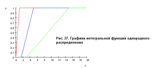 Выбор случайной величины из интервала [a, b] подчиняется этому закону распределения. На рис. 27, 28 указаны графики функций (21) и (22) для (a, b) = (0,1), (1.5,5), (3,15) и – 5 ≤ x ≤ 20.