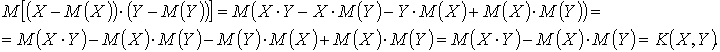 Доказательство. Пусть X = a·Y + b, тогда D (X) = a² ·D (Y) иK (X,Y ) = M [ ( X - M ( X ))·( Y - M ( Y )) ] = M [ ( a Y + b - M ( a Y + b ))·( Y - M ( Y )) ] = M [ ( a Y + b - a M ( Y ) - b)·( Y - M ( Y )) ] = a M [ ( Y -M ( Y ))·( Y - M ( Y )) ] = a M [ Y -M ( Y )]2 = a D (Y) Следовательно,