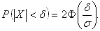 Часто требуется вычислить вероятность того, что отклонение нормально распределенной случайной величины X по абсолютной величине меньше заданного положительного числа δ,т. е. требуется найти вероятность осуществления неравенства | X- a| < δ. Заменим это неравенство равносильным ему двойным неравенством - δ < X - a < δ, или a - δ < X < a + δ. Пользуясь формулой (*), получим