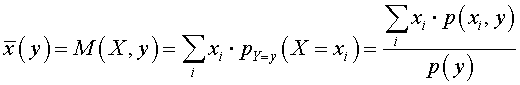 Зависимость между двумя случайными событиями сказывается в том, что условная вероятность одного события при наступлении другого события отличается от безусловной вероятности этого события. Для исследования влияния одной величины на изменение другой величины, рассматривают условные законы распределения первой величины при фиксированных значениях второй величины. Пусть величина Х получила одно из своих значений X = xi; при этом другая величина Y может принять, вообще говоря, любое из своих возможных значений y1, y2, …, yj, …, ym, однако вероятности этих значений будут отличаться от вероятностей p (y1), p ( y2), …, p (yj), …, p (ym).