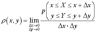 Плотность вероятности определяется как предельное значение отношения вероятности попадания в элементарный прямоугольник с вершиной в точке (х, у) со сторонами Δ x и Δ y параллельными осям координат, к площиди этого прямоугольника, при условии, что стороны прямоугольника стремятся к нулю