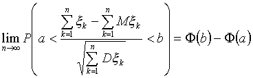 Теорема (центральная предельная теорема в форме А.А. Ляпунова). Если последовательность попарно независимых случайных величин ξ1, ξ2, … , ξn, … удовлетворяет условию