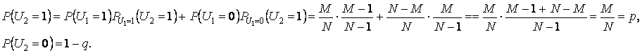 Случайные величины Ui ( i = 1, 2, , n ) могут принимать лишь два значения: 1 и 0 – если i – й член бесповторной выборки соответственно обладает или не обладает признаком А. U 1, U 2, , U n – одинаково распределены. Закон распределения случайной величины U1 такой же, как и случайной величины Z1. Случайная величина U2 имеет такой же закон распределения, так как