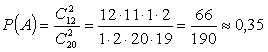 Пример5. В ящике лежат 20 одинаковых на ощупь шаров. Из них 12 белых и 8 чёрных. Наудачу вынимают два шара. Какова вероятность того, что оба шара белые? Какова вероятность того, что они разного цвета?