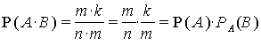 Произведению событий А и В благоприятствуют только те случаи из m, благоприятствующих А, которые благоприятствуют и событию В, т. е. k случаев из n. Таким образом, вероятность события А·В равна: Р (А·В) = k/n. Умножив числитель и знаменатель дроби на m, получим: