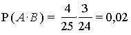 Решение. Искомое событие состоит в том, что нестандартными будут и первая (событие А) и вторая (событие В) лампочки. Вероятность его найдем Р(А) = 4/25, а РА (В) = 3/24, так как при наступлении события А общее число лампочек и число нестандартных среди них по сравнению с первоначальным меньшится на одну. Таким образом,