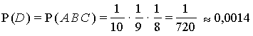 Решение. Искомое событие D произойдет, если первой будет взята карточка с цифрой 1 (событие А), вторая – с цифрой 2 (событие В), третья – с цифрой 5 (событие С). Вероятность его по геореме умножения вероятостей для трех зависимых событий: