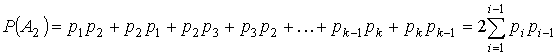 Решение. Событие А – «выход из строя конструкции » распадается на сумму двух вариантов: A = A1 + A2, где А1 – «обе перегрузки произошли на одном узле конструкции, не важно каком »; А2 – «обе перегрузки произошли на соседних узлах конструкции ». Используя теоремы сложения и умножения вероятностей несовместимых событий, получим: