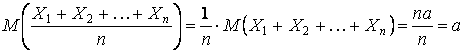 , Хn – одинаково распределённые случайные величины, математическое ожидание каждой их которых равно а, то математическое ожидание их суммы равно n·a, а средней арифметической а.