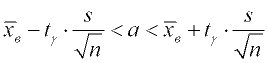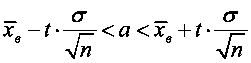 - Интервальной оценкой (с надежностью γ) математического ожидания а нормально распределенного количественного признака X по выборочной средней xв при неизвестном следнем квадратическом отклонении от генеральной совокупности служит доверительный интервал