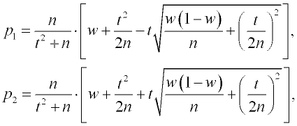 0 < σ < s (1 + q) (при q > 1). - Интервальной оценкой (с надёжностью γ) неизвестной вероятности р биномиального растределения по относительной частоте w служит доверительный интервал ( с приближёнными концами p1 и p2)