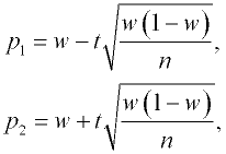 p1 < p < p2, где где n – общее число испытаний; m – число появлений события; w – относительная частота, равная отиошению m / n ; t – значение аргумента функции Лапласа (приложение 2), при котором Ф(t) = γ/2 (γ – заданная надежяость).