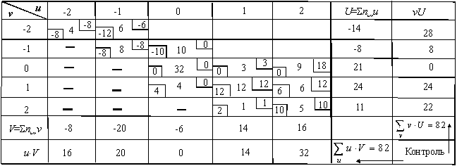 Для контроля аналогичные вычисления производят по столбцам: произведения nuvv записывают в левый нижний угол клетки, содержащей значение частоты; все числа, помещенные в левых нижних углах клеток одного столбца, складывают и их сумму помещают в «строку V»; наконец умножают каждую варианту u на V и в результат записывают в клетках последней строки.