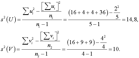 Найдем исправленные выборочные дисперсии:ui − 4 0 − 2 2 6 vi 4 −3 0 3 Сравним дисперсии. Найдем отношение большей исправленной дисперсии к меньшей (каждая из дисперсий увеличилась в 102 раз, но их отношение не изменилось):