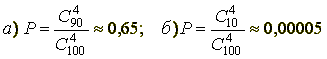 З а д а ч а 32. В ящике 100 деталей, из них 10 бракованных. Наудачу извлечены четыре детали. Найти вероятность того, что среди извлечённых деталей: а) нет бракованных; б) нет годных.