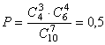 З а д а ч а 20. В обойме из 10 патронов 6 патронов являются меченными. Наугад выбираются 7 патронов. Какова вероятность того, что среди них будут 5 патронов являются меченными?