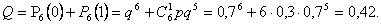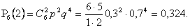 157. Батарея произвела шесть выстрелов по объекту. Вероятность попадания в объект при одном выстреле равна 0,3. Найти: а) наивероятнейшее число попаданий; б) вероятность наивероятнейшего числа попаданий; в) вероятность того, что объект будет разрушен, если для этого достаточно хотя бы двух попаданий.Р е ш е н и е. По условию, n = 6; q = 0,7; p = 0,3. а) Найдем наивероятнейшее число попаданий по формуле
