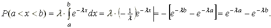 Р е ш е н и е. Первый способ. Пусть величина X задана функцией распределения F(x) = 1 − e- λx (x ≥ 0). Тогда вероятность попадания X в интервал (a, b)