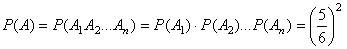 Аn. Вероятность того, что на любой выпавшей грани появится число очков, не равное шести, равна Р (А i) = 5/6. События А i; независимы в совокупности, поэтому применима теорема умножения: