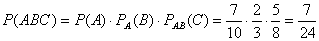 Р е ш е н и е. Введем обозначения событий: A – первым отобран мужчина; В – вторым отобран мужчина, С – третьим отобран мужчина. Вероятность того, что первым будет отобран мужчина, P (A) = 7/10.