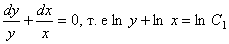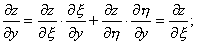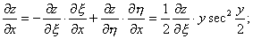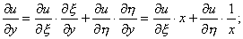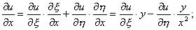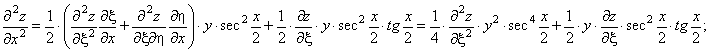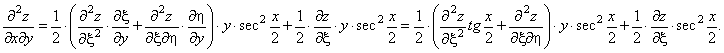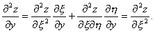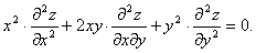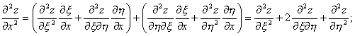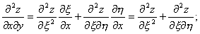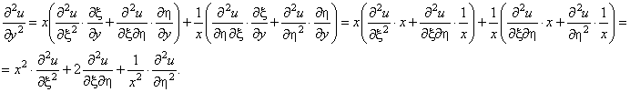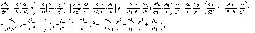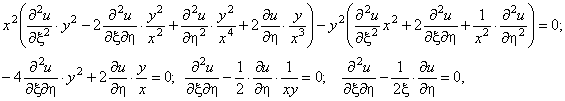 Составляем уравнение характеристик:x²(dy)² - y²(dx)² = 0 или (x dy + y dx)·(x dy - y dx) = 0. Получаем два дифференциальных уравнения x dy + y dx = 0 и = 0;разделяя переменные и интегрируя, имеем После потенцирования находим xy = C1 и y/x = C2 – уравнения двух семейств характеристик. Введем новые переменные ξ = xy, η = y/x. Выразим частные производные по старым переменным через частные производные по новым переменным: