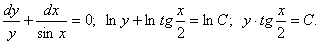 Разделяя в уравнении sin x dy + t dx = 0 переменные и интегрируя, имеем Произведем замену переменных: