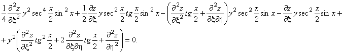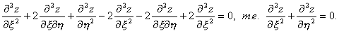Уравнение характеристик имеет вид (dy)² + 2 dx dy +2 (dx)² = 0 или (y ′ )² + 2 y ′ + 2 = 0. Отсюда y ′ = - 1 ± i; получаем два семейства мнимых характеристик: y + x - i x = C1, y + x + i x = C2. Произведя замену переменных ξ = y + x, η = xимеем Подставив найденные выражения в дифференциальное уравнение, получаем