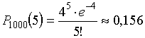 Пример 17. Прядильщица обслуживает 1000 веретён. Вероятность обрыва нити на одном веретене в течение одной минуты равна 0,004. Найти вероятность того, что в течении одной минуты обрыв произойдет на пяти веретенах.