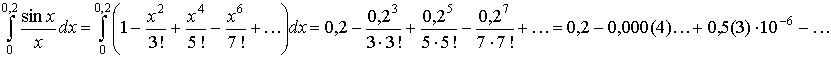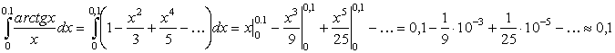 После интегрирования получается знакочередующийся числовой ряд и погрешность от замены ряда его частичной суммой меньше первого отбрасываемого члена, то есть меньше чем
