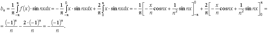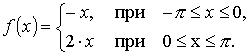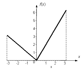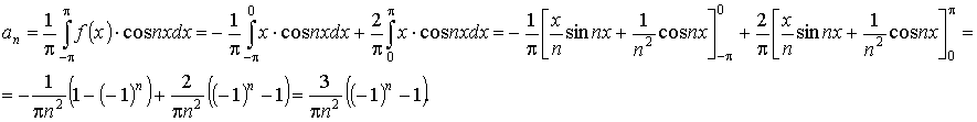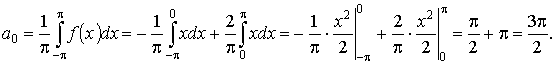 Из графика видно, что функция не обладает свойством чётности, и не обладает свойством нечётности. Вследствие этого к ней не применимы теоремы, упрощающие вычисление коэффициентов Фурье. Будем считать, что на интервале [− π; + π] указанная функция представляется тригонометрическим рядом Фурье: