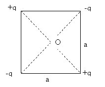 q как указано на рисунке. Какова напряжённость электрического поля в центре квадрата в точке О.