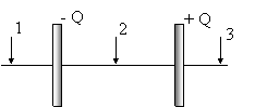 В каком из приведённых ниже вариантов ответов правильно указаны значения напряжённости поля двух разноимённо заряженных проводящих плоскостей (смотри рисунок), площадью S каждая, по которым равномерно распределён заряд Q в точках 1, 2 и 3 соответственно. ε