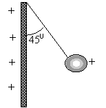 Плотность заряда пластинки, изображённой на рисунке, равна 17,7·10-9Кл/см². К ней подвешен шарик массой 1 г. Найдите заряд шарика, если угол между пластинкой и нитью, на которой подвешен шарик, равен 45°. |