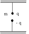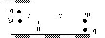 На концах стержня длиной 5l находят-ся положительные заряды q1 и q2. Над зарядом q2 расположен заряд - q, а под зарядом q1 расположен положительный заряд q. Чему должно быть равно соотношение q2 / q1, чтобы стержень находился в горизонтальном равновесии? Весом стержня пренебречь. |