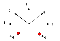 Найдите направление вектора напряжённости электрического поля в точке О, равноудалённой от двух положительных зарядов + q. |