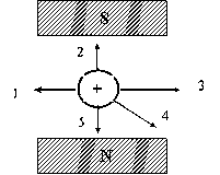 Протон двигается перпендикулярно силовым линиям магнитного поля, как изображено на рисунке. Найдите направление силы, действующей на протон. |