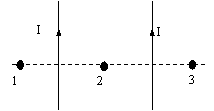 На рисунке приведены два прямых параллельных проводника с токами I. В какой из трёх точек, показанных на рисунке, равна нулю результирующая индукция магнитного тока? |