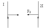 По двум вертикальным параллельным проводникам текут токи I и 2I соответственно. Каково соотношение сил F1 : F2, действующих на проводники со стороны магнитного поля, создаваемого другим проводником? |