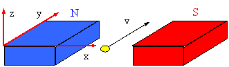 Между полюсами постоянного магнита пролетает электрон параллельно оси y. В каком направлении отклонится электрон? |