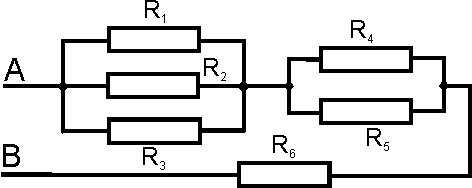 На рисунке дана схема соединения шести одинаковых резисторов по 60 Ом. Определить силу тока в каждом резисторе, если напряжение между точками А и В равно 220 В.![]() |