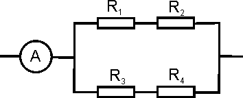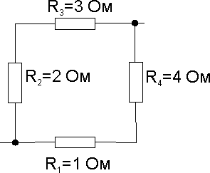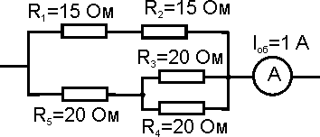На рисунке дано смешанное соединение резисторов: R1 = 10 Ом, R2 = R3 = 20 Ом, R4 = 40 Ом. По каким резисторам протекает ток наибольшей мощности и какова общая мощность тока, потребляемая цепью, если Iоб = 3 А?![]() |