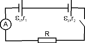 Два источника тока с ε1 = 60 В и ε2 = 20 В соединены, как показано на рисунке. Определить сопротивление второго источника тока, если внутреннее сопротивление первого источника тока r1 = 5 Ом, сопротивление внешней цепи R = 12 Oм, сила тока в цепи I = 4 А.![]() |
