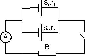 Два аккумулятора с ЭДС ε1 = 60 В и ε2 = 40 B и внутренними сопротивлениями r1 = 4 Ом и r2 = 1 Ом соединены в батарею, как показано на рисунке. Определить силу тока короткого замыкания батареи.![]() |