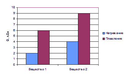 На диаграмме для двух веществ приведены значения количества теплоты, необходимого для нагревания 1 кг вещества на 10 °С и для плавления 100 г вещества, нагретого до температуры плавления. Сравните удельную теплоту плавления λ1 и λ2 двух веществ.