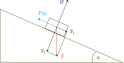| Тело, весом Р, скользит по наклонной плоскости вниз. Коэффициент трения μ. Как определяется сила трения, действующая на тело ? Из приведённых соотношений выберите верный ответ. |