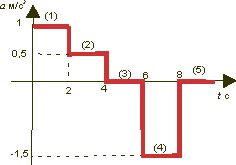 | Лифт с мальчиком, масса которого m = 45 кг начал двигаться из состояния покоя вверх. График изменения ускорения движения лифта указан на рисунке. Считать g = 9,8 м/с2. Указать: а) минимальный вес мальчика; б) его максимальный вес: в) интервалы равномерного движения лифта; г) время (сек ), за которое лифт остановился; д) участки, на которых вес мальчика равен силе притяжения его к Земле? ![]() |