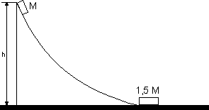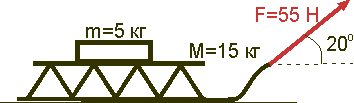 Маленький брусок массой М начинает двигаться из состояния покоя с вершины горки, имеющей криволинейное поперечное сечение (см. рисунок). Трением бруска о горку можно пренебречь. Соскользнув с горки, брусок набирает скорость 3,5 v0 и сталкивается с покоящемся бруском массой 1,5 М, находящемся внизу горки. Сразу после столкновения скорость большего бруска составляет 2 v0. Большой брусок после столкновения начинает скользить и, пройдя расстояние D, останавливается Определите:| Мальчик тянет за собой по горизонтальной поверхности вдоль прямой санки массой 15 кг, на которых лежит коробочка массой 5 кг. Он прикладывает силу 55 Н под углом 20° к горизонту ( sin 20° = 0,342, cos 20° = 0.94 ) как показано на рисунке. Коэффициент трения между санками и поверхностью равен 0,22. g = 9,8 м/с2. Вычислите : а) силу, действующую на сани перпендикулярно поверхности ( Н ); б) ускорение системы ( м/с2 ); в) работу, совершённую силой, приложенной мальчиком, при перемещении саней на расстояние 7 м ( Дж );