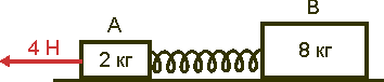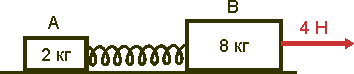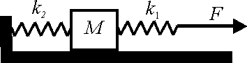 К системе из кубика массой 1 кг и двух пружин приложена постоянная горизонтальная сила F (см. рисунок). Между кубиком и опорой трения нет. Система покоится. Жёсткость первой пружины k1= 300 Н/м. Жёсткость второй пружины k2 = 600 Н/м. Удлинение первой пружины равно 2 см. Модуль силы F равен: